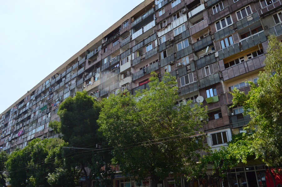 Oddalając się od Placu Republiki - oczka wodnego w suchym mieście - trafić można w sam środek socjalistycznych porządków. Rubel postawił tu ohydne bloki dla podbitego i dociśniętego butem rewolucji ludu, jednak nigdy nad Ormianami się nie znęcał, przeciwnie, wysyłał tony towarów, żeby kraj wyglądał bogato i aby zadowoleni obywatele nie myśleli o buncie. Sowieci miłujący ukradkiem piękno Armenii, postawili na terenie całego kraju bloki mieszkalne, których brzydota odbiera apetyt, tym bardziej, że udekorowane są gęsto suszącą się w oknach i balkonach kolorową pościelą, pasiastymi ręcznikami, dziesiątkami par dżinsowych spodni.
