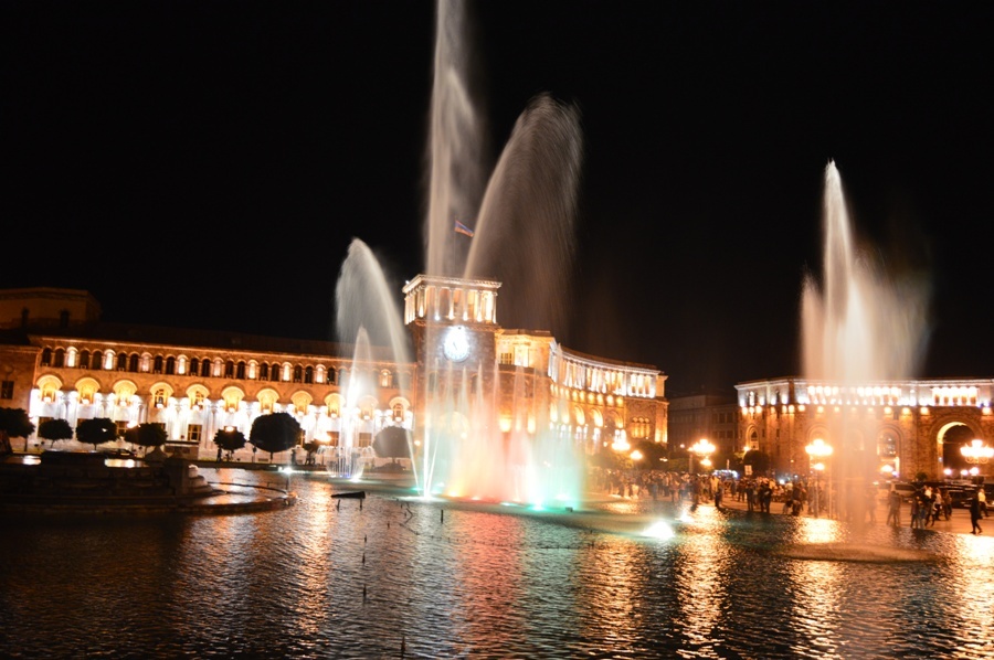 Trudno znaleźć schronienie przed nieznośnym słońcem w najchętniej odwiedzanym miejscu stolicy. Wokół Placu Republiki, centralnym punkcie Erywania, wybudowanego z kolorowego tufu - ormiańską myślą architektoniczną i za radzieckie pieniądze - bez ustanku krążą rozgrzani ludzie i samochody. Dopiero wieczorem robi się tu chłodniej i wolniej. Turyści przychodzą popatrzeć na imponujący pokaz światła i tańca fontann - na godzinę klasyczna muzyka zastępuje dźwięk klaksonów, którymi kierowcy wyrażają swoją frustrację, ostrzegają przed niebezpieczeństwem kolizji, informują przechodniów, że jadą!
