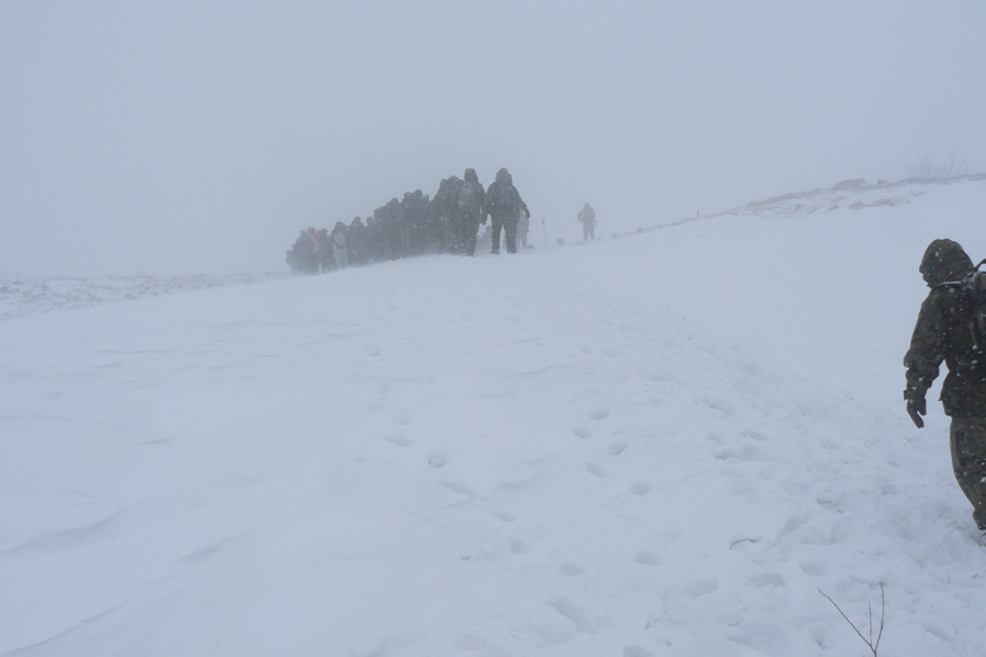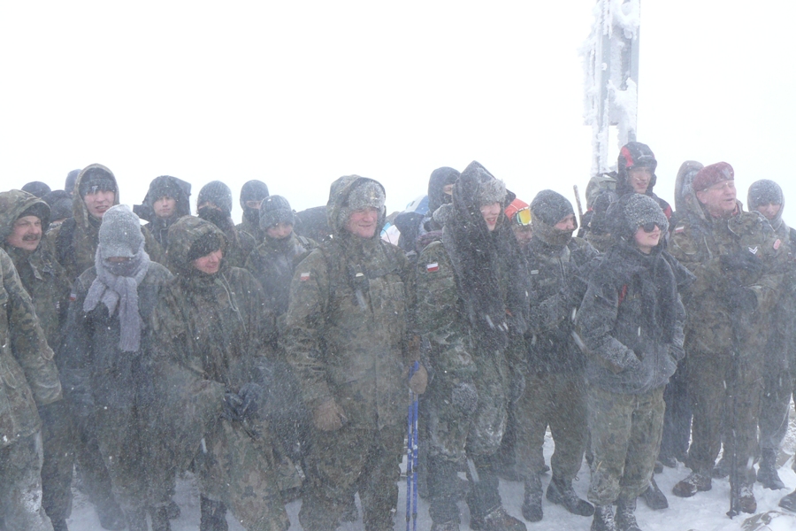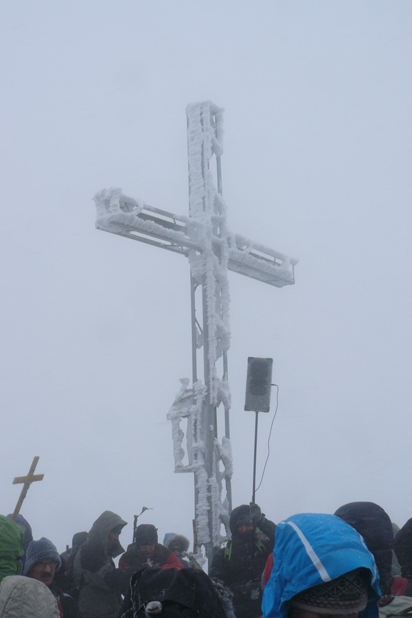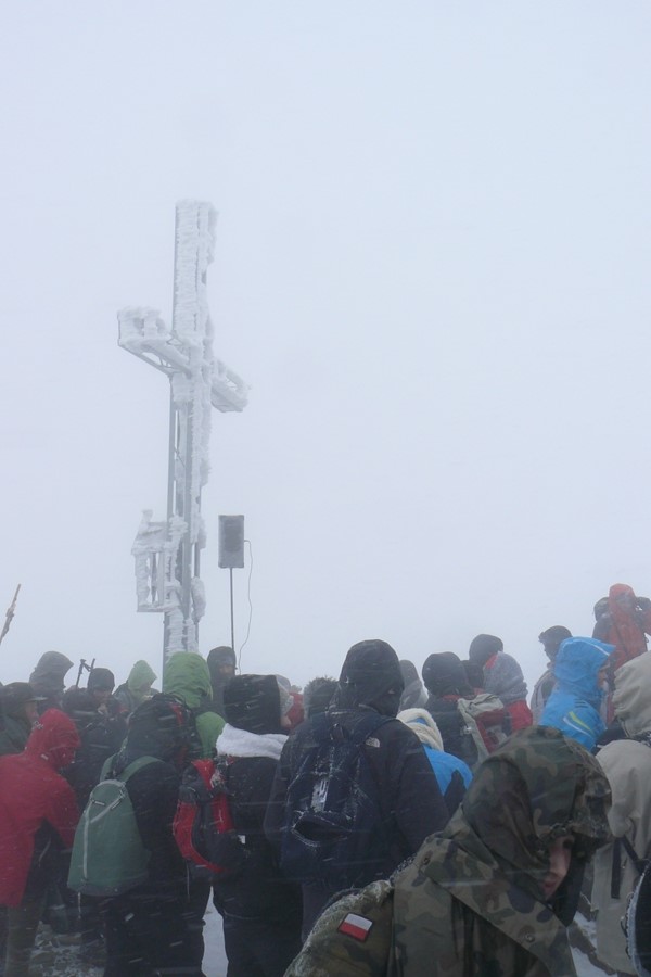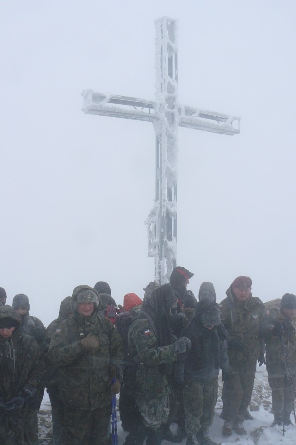 Pogoda zaczęła się szybko pogarszać. Prószyć zaczęło, gdy byliśmy jeszcze w lesie. Gdy wyszliśmy z lasu na otwartą przestrzeń, przywitała nas mgła (widoczność spadła do kilku metrów), silny wiatr i zmrożony śnieg sieczący po twarzy. Powyżej przełęczy pod krzyżem na Smereku widoczność była już tak słaba, że gdyby nie jeden z pielgrzymów, który nas zawrócił, wraz z mł. insp. Jackiem Magdoniem ze „Strzelca” zeszlibyśmy ze szlaku. Warunki pogodowe stały się na tyle ekstremalne, że przy krzyżu na Smereku zatrzymaliśmy się tylko na 10 minut, po czym cała grupa szybko i szczęśliwie zeszła do autokaru. Po drodze insp. Magdoń połączył się telefonicznie ze swoimi znajomymi, którzy akurat schodzili z… Tarnicy. Było trochę śmiechu, bo ktoś na internecie w telefonie komórkowym przeczytał, że straż Bieszczadzkiego Parku Narodowego nie wpuszcza pielgrzymów na Tarnicę.