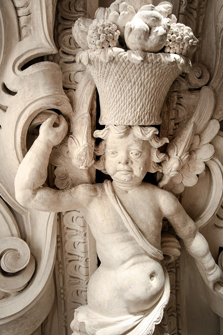 Wspaniała dekoracja stiukowa jest niepowtarzalnym dziełem geniuszu J.Ch. Falconiego. Największe bogactwo i piękno kryje czasza kopuły: ornamenty stiukowe zdają się tańczyć, wirować. Wrażenie to potęguje światło z okien latarni i anioły w roztańczonych pozach, dźwigające na swych głowach kosze pełne owoców fig lub granatów. Owoce figi – częsty motyw większości sztukaterii Falconiego – były atrybutem Ducha Świętego. Owoc granatu symbolizuje Kościół, a także pełnię ludzkiego życia. Każdy anioł jest inny, z odmiennym wyrazem twarzy, pomiędzy nimi maszkarony powstałe z pozawijanych wolut i wici roślinnych, wyrastających jedne z drugich, girlandy kwiatów, ślimaki, woluty, karbowane chusty. Dynamiczne przestrzenie, mięsiste, światłocieniowe - zdawałoby się wychodzące ze ściany - kontrastują z płaskimi i spokojnymi tłami kartuszy. Czasza kopuły tonie w pięknej, szlachetnej, ugrowo-szarej tonacji.