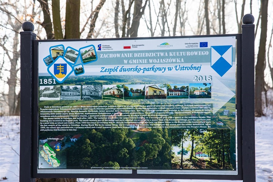 Na przykład dwór w Ustrobnej: skromny parterowy budynek w stylu klasycystycznym, otoczony malowniczym parkiem w stylu angielskim, z czytelnym układem ścieżek, gazonem przed głównym wejściem, oraz stawem, który w wyniku powodzi uległ zniszczeniu. Dzięki W skład majątku dworskiego wchodziły również budynki gospodarcze, z których do dziś pozostały tylko spichlerz i stajnia. Odnowiony spichlerz aktualnie pełni funkcje ośrodka zdrowia dla mieszkańców oraz remizy strażackiej.