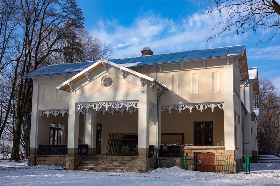 Z werandy rozpościera się widok na okrojony przez reformę rolną w 1944 r. park. Z jego obrzeży znikły zabudowania dawnego folwarku. Pojawiły się nowe, socjalistyczne.