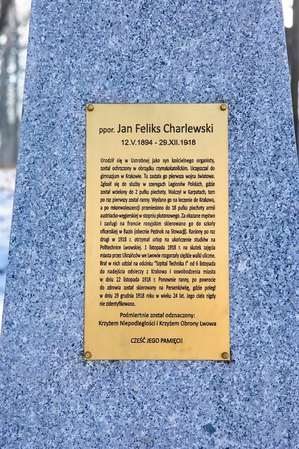 Obok podjazdu do dworu w Ustrobnej, w otoczeniu parkowym usytuowano niezwykły pomnik - obelisk zwieńczony postacią lwa – symbol Orląt Lwowskich. Monument powstał ku czci podporucznika Jana Feliksa Charlewskiego, którego historia do ubiegłego roku nie była obecnym mieszkańcom znana. Według informacji, jakie udało się pozyskać, wiemy, iż urodził się w Ustrobnej, był synem tutejszego organisty. Wybuch wojny zastał go w Krakowie, gdzie uczęszczał do gimnazjum. Jako młody chłopak sam zgłosił się do Legionów Polskich. Służył w 2. pułku piechoty. Walczył w Karpatach, gdzie został ranny. Po rekonwalescencji w Krakowie, zgłosił się do walki na front rosyjski. Raniony po raz drugi, otrzymał urlop na studia na Politechnice Lwowskiej. 1 listopada 1918 r., gdy Lwów został zajęty przez Ukraińców, w mieście rozgorzały ciężkie walki. Charlewski poległ 29 grudnia 1918 r. w wieku 24 lat. Jego ciała nigdy nie zidentyfikowano. Pośmiertnie został odznaczony Krzyżem Niepodległości oraz Krzyżem Obrony Lwowa. Uroczystości upamiętniające oraz odsłonięcie pomnika odbyły się 18 sierpnia 2018 r. Jest to jeden z pierwszych pomników na powstającym Ogólnopolskim Szlaku Orląt Lwowskich.