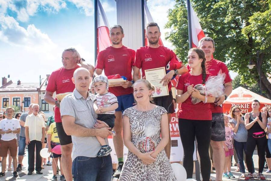 Dynów, 2017 rok. Finał akcji "Przez Polskę dla serca i krwi". Na zdjęciu Łukasz Domin i Sławek Hadro z rodzicami Kacperka Słabego. Fot. Facebook