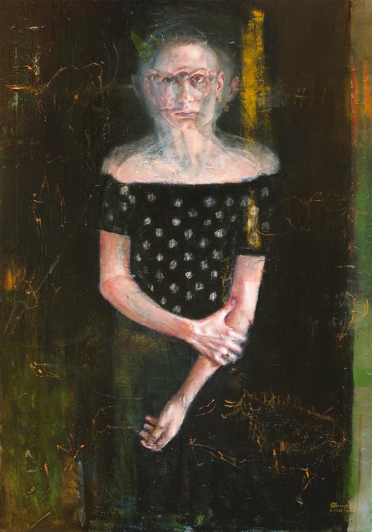 Na dużym, 80x100 cm, płótnie rozchwiana postać kobiety. Twarz jakby rozwarstwiła się na kilka przezroczystych. Z obrazu przebija wzrok pomnożonych źrenic. Postać prawą dłonią nerwowo zaciska lewe przedramię. Jakby wychodziła z ciała, nie wiedziała, co się z nią dzieje. Boi się. Z ciemnego tła wyglądają mamuty.