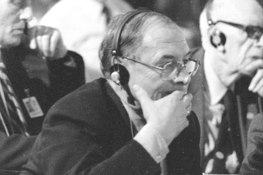 Prof. Józef Szajna podczas Kongresu Intelektualistów w Obronie Pokojowej Przyszłości Świata w Hotelu Victoria w Warszawie, 1986 rok. Fot. NAC