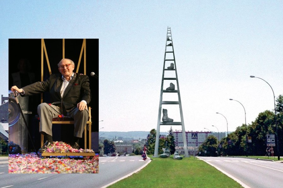 Drzewa rosnące na pasie między drogami były wtedy ledwie sadzonkami. Dziś nieco przesłaniają widok, ale wtedy panorama miasta była jak na dłoni. Widzieli to w wyobraźni: monumentalna drabina, na niej buty, a przez prześwity widok na miasto. Dialog tych co odeszli z tymi, którzy żyją.