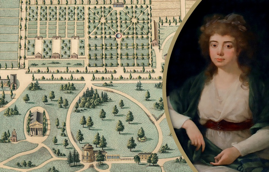 Reprodukcja Pietro Labruzzi "Portret Magdaleny z Dzieduszyckich Morskiej", Rzym 1793 r. Muzeum w Jarosławiu oraz Plan ogrodów w Zarzeczurycina w "Zbiorze rysunków..." M. Morskiej, 1836 r. Muzeum w Jarosławiu.