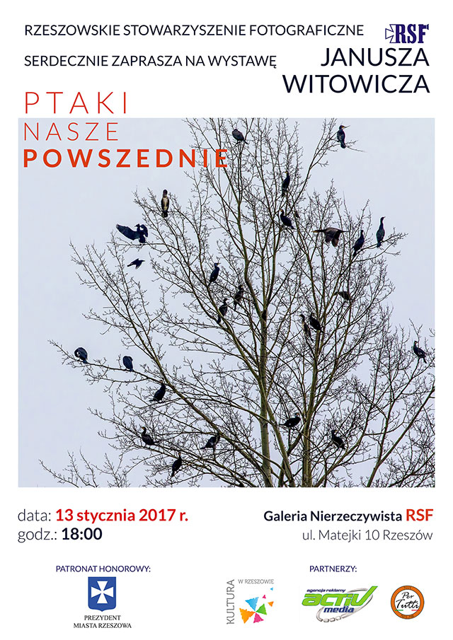 Fotografie prezentowane na autorskiej wystawie Janusza Witowicza pt. Ptaki nasze powszednie, od 13 stycznia do 9 lutego 2017 roku będzie można oglądać w Galerii Nierzeczywistej Rzeszowskiego Stowarzyszenia Fotograficznego przy ul. Matejki 10 w Rzeszowie. Uroczysty wernisaż odbędzie się w piątek 13 stycznia o godz. 18:00.