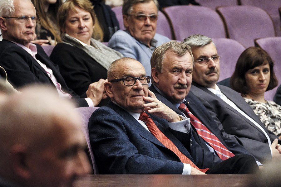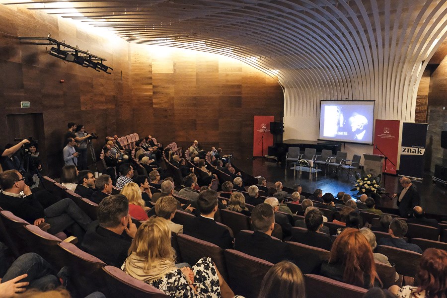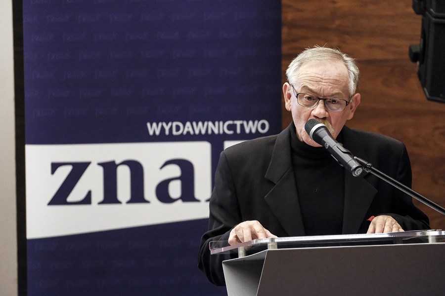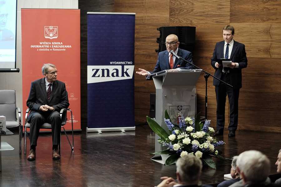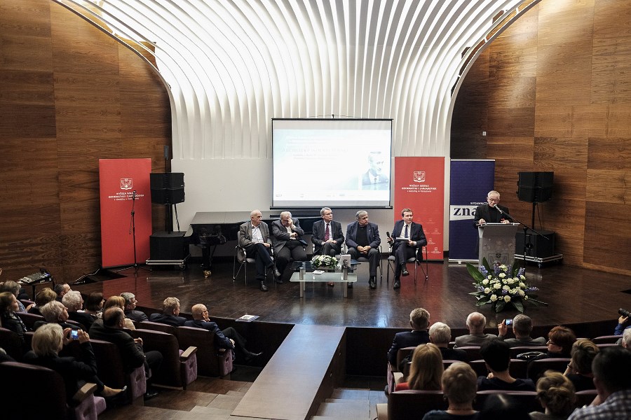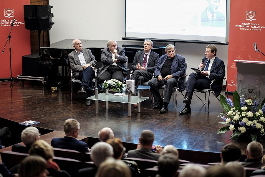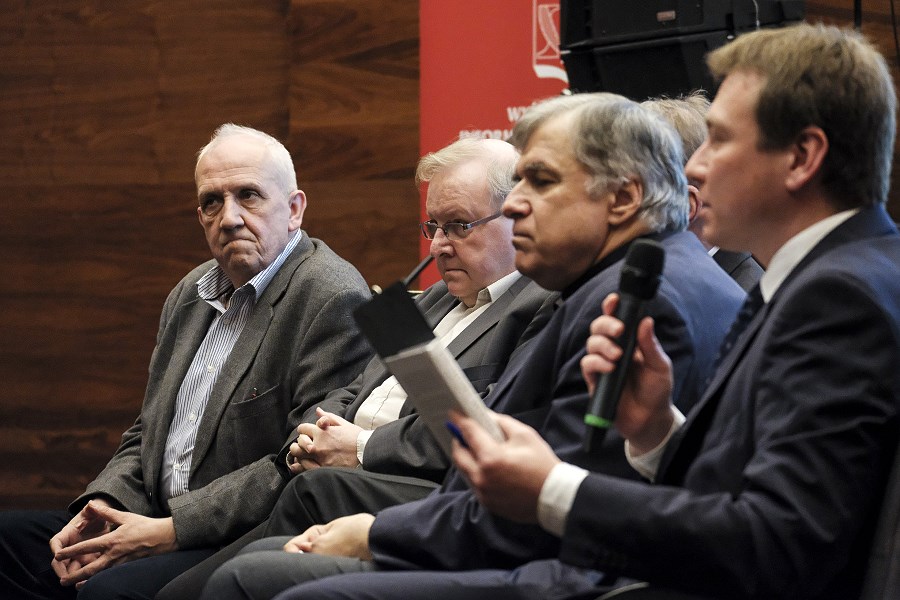 Od lewej: prof. Andrzej Friszke, prof. Aleksander Hall, Henryk Woźniakowski, o.Maciej Zięba i Andrzej Brzeziecki. Fot. Patryk Ogorzałek
