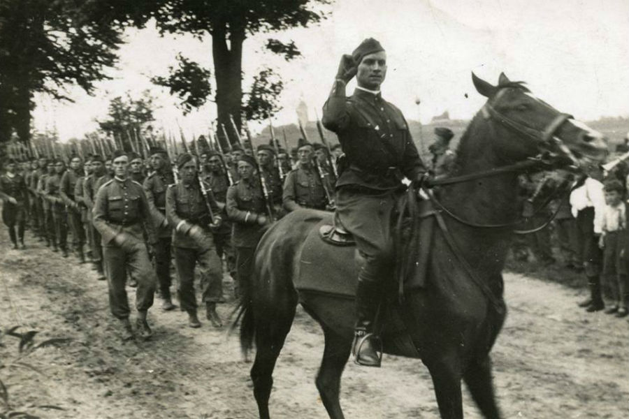 Fot. Podporucznik Łukasz Ciepliński na czele pododdziału 62. Bydgoskiego Pułku Piechoty, 1939 r., sygn. IPN Rz 133/82
