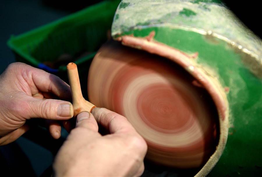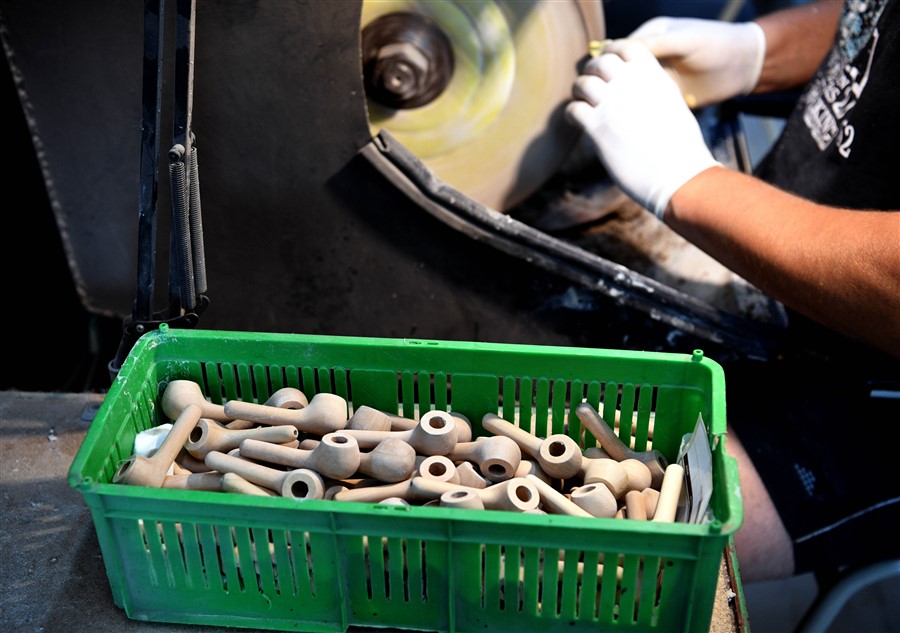 Później przychodzi kolej na barwienie główki. Bejce nakładamy kilkakrotnie a następnie polerujemy na różnorakich polerkach. Fajka nabiera szlachetnego kształtu, koloru i połysku. Należy jeszcze dokonać karbonizacji paleniska polegające na pokryciu wnętrza paleniska specjalnym mieszanką m.in szkła wodnego i sadzy. Na końcu sprawdzamy każdy egzemplarz tak, by eliminować niedociągnięcia. Woskowanie ostateczną polerką, twardym woskiem „Carnauba” wieńczy dzieło. Jeszcze tylko stempel firmowy, nr katalogowy fajki, nazwa, wygrawerowana laserem...czasem też inne znaki graficzne, ozdoby (np. znaki zodiaku), monogram, ewentualnie herb właściciela.