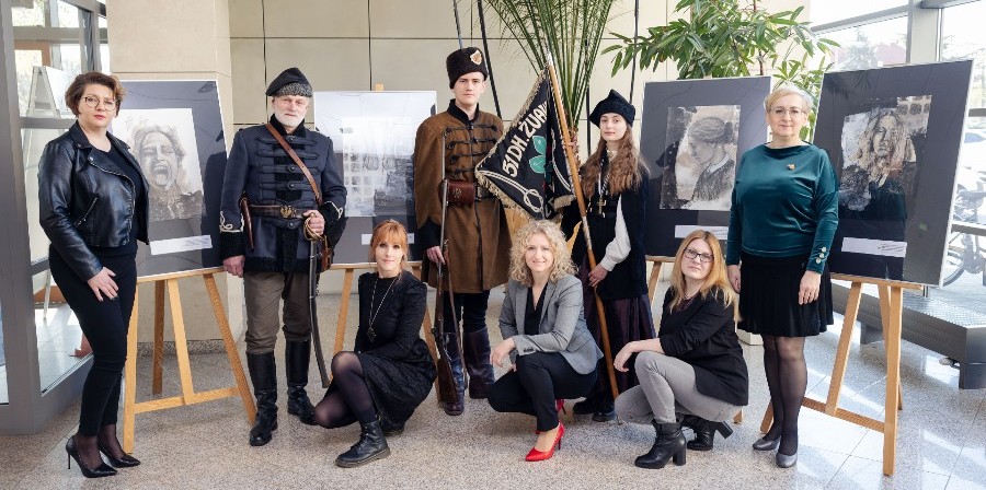 Wystawa w ramach projektu "Ciche bohaterki", jego pomysłodawcy i uczestnicy. Wraz z harcerzami z 51 Drużyny Harcerzy i Harcerek Żuawi w strojach z czasów powstania styczniowego stoją: (od lewej) Katarzyna Gargała, dyrektor Gminnego Ośrodku Kultury i Rekreacji w Czarnej i zarazem pomysłodawczyni projektu, Nina Zielińska Krudysz - autorka grafik, Jolanta Superson, specjalista w GOKiR w Czarnej, Agnieszka Cieślicka, koordynator projektu "Ciche bohaterki" oraz Izabela Fac z Kancelarii Sejmiku Województwa Podkarpackiego. Fot. Archiwum GOKiR w Czarnej