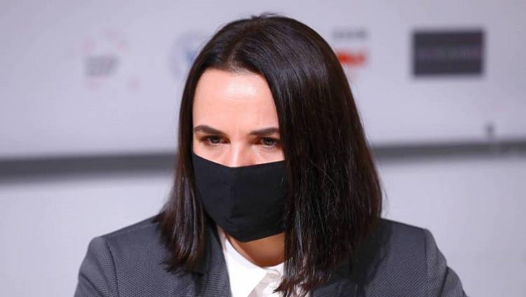 Rafał Guz/PAP Warszawa, 20.10.2020. Liderka białoruskiej opozycji Swiatłana Cichanouska podczas okrągłego stołu w sprawie represjonowanych Białorusinów, 20 bm. w siedzibie Centrum Białoruskiej Solidarności w Warszawie.