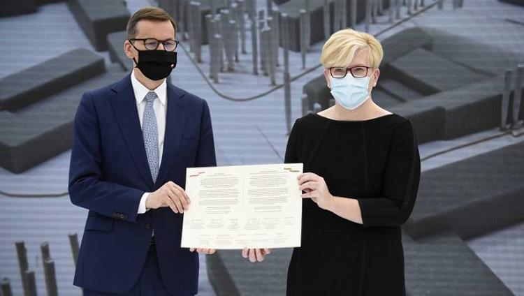 Valdemar Doveiko/PAP Wilno, Litwa, 02.05.2021. Premier Mateusz Morawiecki (L) oraz premier Republiki Litewskiej Ingrida Simonyte (P) podczas uroczystości podpisania aktu erekcyjnego dotyczącego rozbudowy Domu Kultury Polskiej oraz nowej siedziby TVP Wilno w Domu Kultury Polskiej w Wilnie, 2 bm. Trwa wizyta szefa polskiego rządu na Litwie.