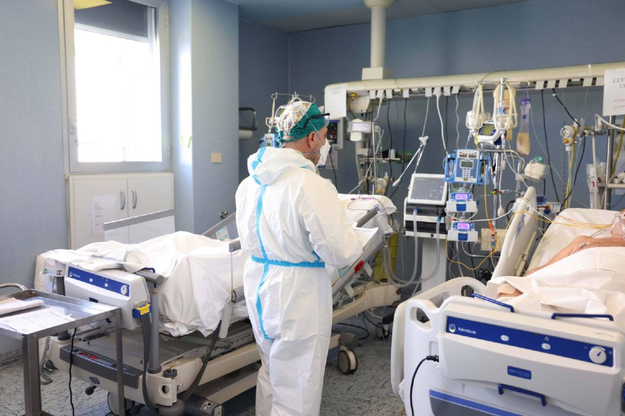 Lekarze i pielęgniarki ubierają odzież ochronną, by opiekować się pacjentami na intensywnej terapii w szpitalu w Cremonie, w północnych Włoszech. Fot. SIMONE VENEZIA/EPA/PAP