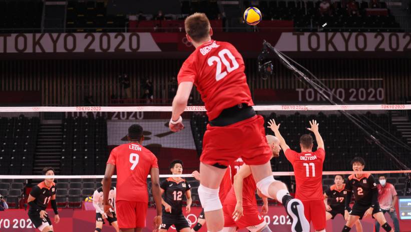 Igrzyska Olimpijskie - Tokio 2020, 30 bm. Polacy Wilfredo Leon (L), Mateusz Bieniek (C) i Fabian Drzyzga (P) podczas meczu 4. kolejki grupy A turnieju siatkarzy z Japonią, w hali "Ariake Arena". Fot. Leszek Szymański/PAP
