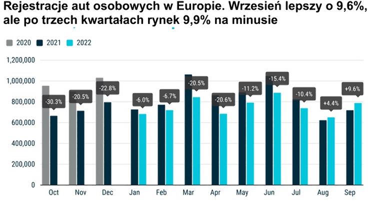 Od początku roku do końca września w krajach Unii Europejskiej, EFTA i w Wielkiej Brytanii zarejestrowano łącznie 8,3 mln nowych samochodów osobowych. Wynik jest 9,7 proc. gorszy niż w tym samym okresie zeszłego roku, co ciągle jest skutkiem ograniczonej podaży wielu podzespołów – koncerny po prostu nie mają z czego produkować tylu samochodów, ile Europejczycy chcieliby kupić.