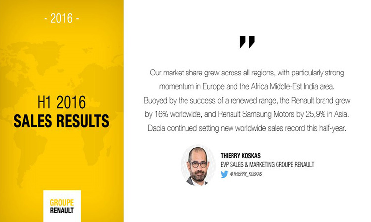 Nasz udział w rynku zwiększył się we wszystkich regionach, przy czym szczególny wzrost odnotowaliśmy w Europie oraz w rejonie Afryki, Bliskiego Wschodu i Indii.Na fali sukcesu odnowionej gamy modeli marka Renault odnotowała wzrost o 16% w skali światowej, a Renault Samsung Motors o 25,9% w Azji.Dacia kontynuowała wzrost, ustanawiając nowy światowy rekord sprzedaży w tym półroczu – powiedział Thierry Koskas, członek Komitetu Wykonawczego Grupy Renault i Wiceprezes Zarządu ds. Sprzedaży i Marketingu.