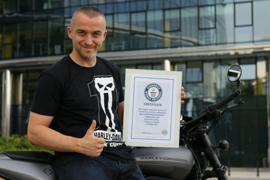 Maciej "DOP" Bielicki z certyfikatem Biura Rekordów Księgi Guinnessa. Fot. GOC Harley-Davidson Rzeszów