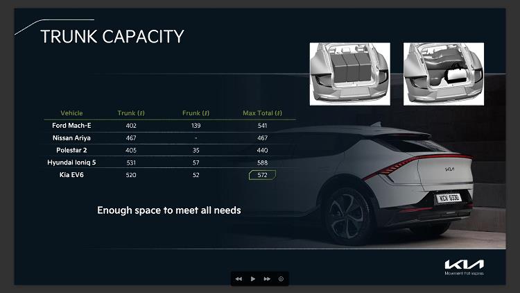 468 cm długości to 20 cm więcej niż w przypadku Sportage’a i tylko 13 cm mniej niż mierzy nowe Sorento. Czyli mamy coś pomiędzy tymi dwoma modelami. Ale już rozstaw osi Kii EV6 to 290 cm, czyli o 8,5 cm więcej niż w Sorento i aż 23 cm więcej, niż w Sportage! Do tego jest szerzej i niżej niż w przypadku tego drugiego. To oznacza, że mamy bardziej sportową sylwetkę, ale z niesamowicie przestronnym wnętrzem. Baterie ukryto w podłodze, silniki są kompaktowe, więc udało się maksymalnie wykorzystać przestrzeń. I zmieścić dwa bagażniki. Ten z tyłu ma 520 litrów pojemności (aż 1300 po złożeniu tylnych foteli), ale jest jeszcze drugi – pod przednią maską. W wersji z napędem na tylną oś mieści 52 litry, czyli – w praktyce – walizkę kabinową lub większy plecak. Jak szybko pewnie policzyliście EV6 łącznie może oferować 572 l pojemności w dwóch bagażnikach.