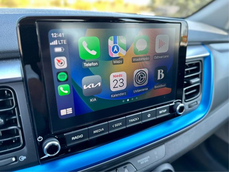 Nawet kierownicę obszyto niebieską nicią, a jakość lakierowanych elementów jest tak wysoka, że sprawiają wrażenie aluminiowych. Wszystko to w połączeniu z jasnymi wstawkami w tapicerce sprawia, że środek Stonica wydaje się ładny, stylowy i wesoły. Człowiek patrzy na to wszystko i się uśmiecha. Do tego wszystko tutaj jest bardzo praktyczne i intuicyjne w obsłudze – przyciski i pokrętła są tam, gdzie być powinny, zegary czytelne, a ekran multimedialny szybko reaguje na dotyk i ma – uwaga! – bezprzewodowy Apple CarPlay i Android Auto. Parujecie tylko telefon i na ekranie auta wyświetla się Wam np. nawigacja Google Maps. Jedyny zauważalny mankament, to trochę za miękkie fotele z mizernym podparciem bocznym. Ale zaznaczam, że to moje subiektywne odczucie.