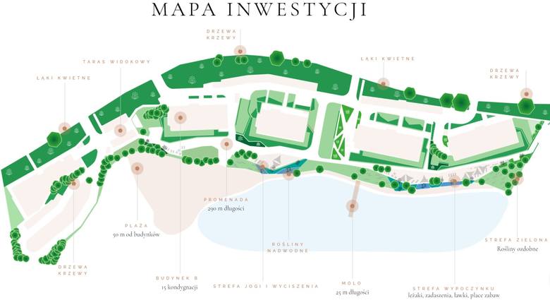 Za to wszyscy bez wyjątku zyskują dostęp z prywatnej plaży, 25-metrowego molo, deptaku spacerowego oraz strefy relaksu i leżakowania, wyposażona w hamaki i leżaki, a także mini port dla łódek i kajaków. Zaprojektowano tu wybieg dla psów i place zabaw. Ma być także łąka kwietnia z około setką roślin. Na osiedlu standardowo już zaplanowano także sklepy, restauracje i usługi typu wellness.