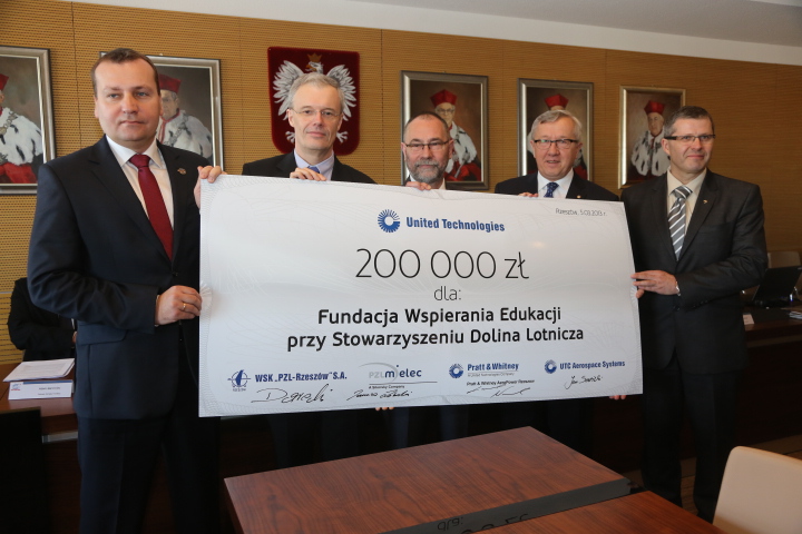 Finansowe wsparcie edukacyjnych działań Politechniki Rzeszowskiej i Stowarzyszenia Dolina Lotnicza to jeden z priorytetów Fundacji. Podczas oficjalnej inauguracji jej działalności ogłoszono pierwszą darowiznę. Czek na kwotą 200 tys. zł przekazały firmy: WSK PZL Rzeszów, PZL Mielec, UTC Aerospace (dawny Goodrich) oraz Pratt&Whitney Aero Power, wchodzące w skład United Technologies. - Działania popularyzujące wśród młodzieży nauki ścisłe, długofalowo przyniosą korzyść całej gospodarce. Cieszy mnie szczególnie, że w krótszej perspektywie beneficjentem będzie także szkolnictwo wyższe, które pozyska liczne grono dobrze przygotowanych studentów - podsumował prof. Marek Orkisz, rektor Politechniki Rzeszowskiej.