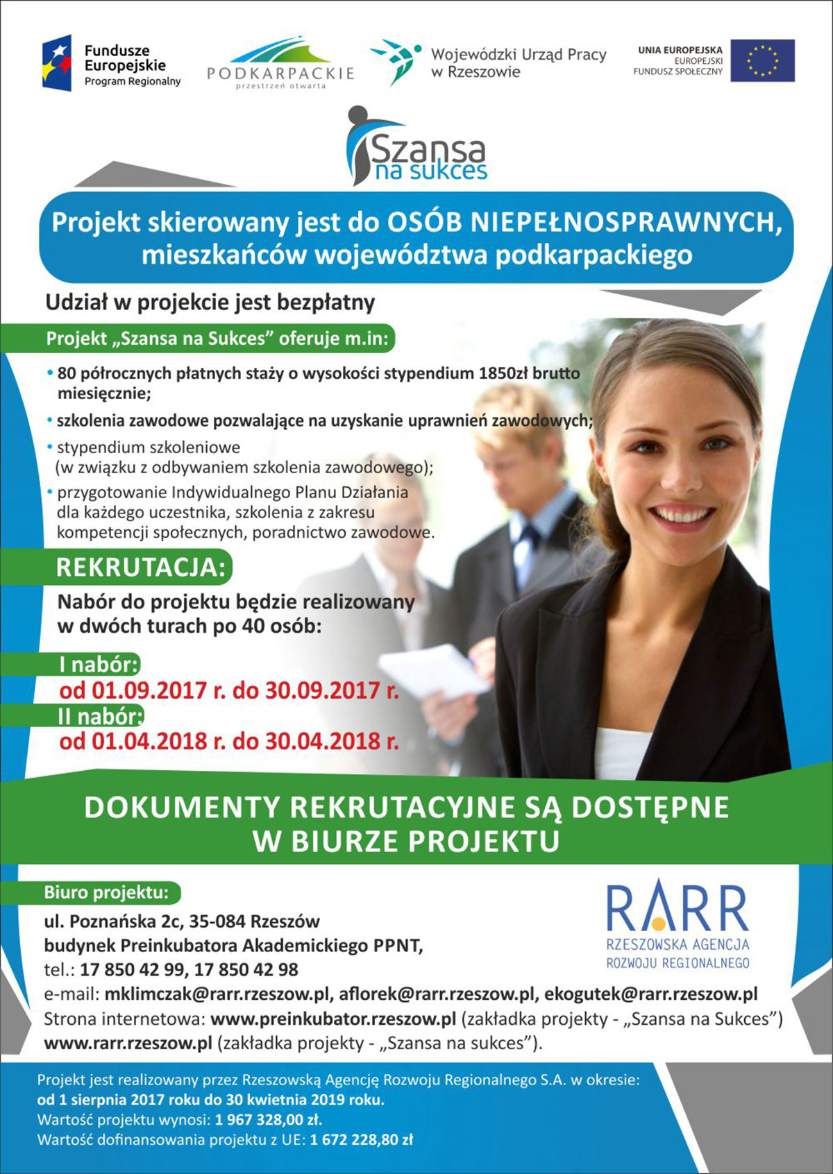 Płatne staże przez pół roku, szkolenia zawodowe, treningi z zakresu aktywizacji zawodowej – osoby niepełnosprawne z Podkarpacia mają szansę na udział w projekcie, który pozwoli im przełamać bariery psychologiczne i wejść na rynek pracy. Projekt „Szansa na Sukces”, realizowany przez Rzeszowską Agencję Rozwoju Regionalnego S.A., jest atrakcyjny także dla pracodawców. Nabór trwa do końca września br. Szansę za zatrudnienie ma 48 kobiet i 32 mężczyzn.