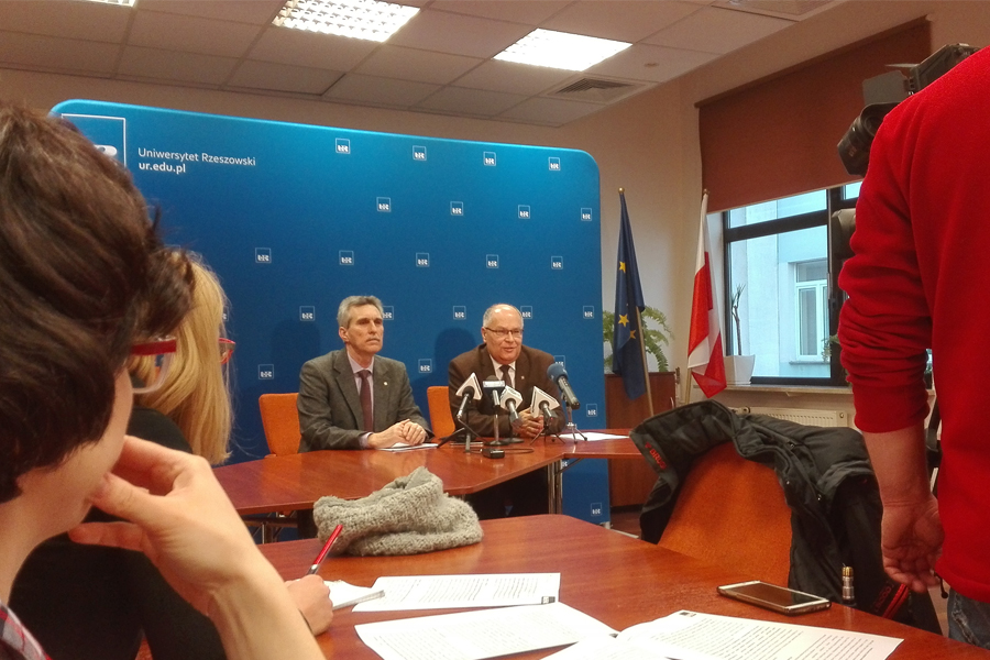 Prof. Sylwester Czopek i dr hab. Grzegorz Ślusarz poinformowali o decyzji Senatu UR podczas konferencji prasowej w piątek, 22 grudnia. Fot. Redakcja