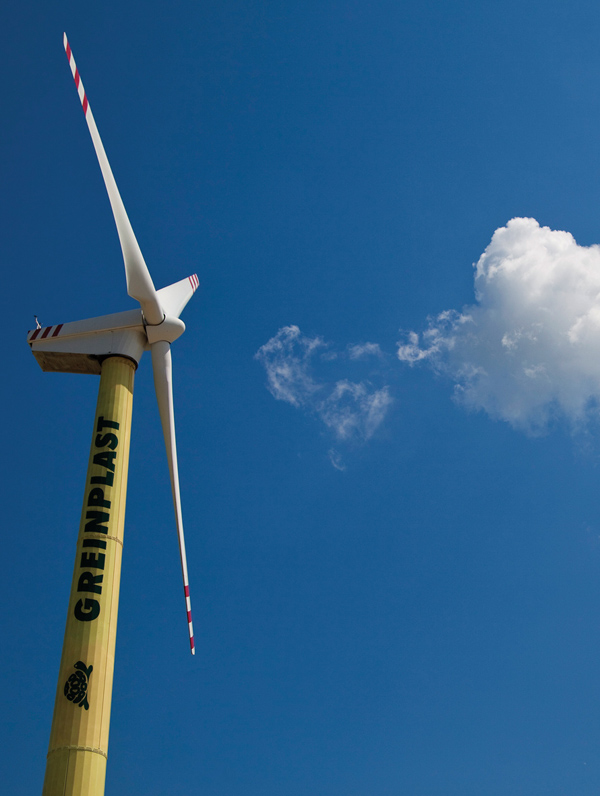 Pierwszą inwestycją w tym zakresie zrealizowaną przez Greinplast była budowa elektrowni wiatrowej, którą stanowi zespół urządzeń produkujących energię elektryczną za pomocą turbiny wiatrowej. Energia pozyskiwana z wiatru jest uznawana za tzw. energię czystą ekologicznie, gdyż do jej produkcji nie spala się żadne paliwo. Dodatkowym argumentem są dogodne warunki do wytwarzania energii elektrycznej z wiatru, jakie panują w Polsce. Oczywiście stworzenie takiej elektrowni to wydatek, ale koszty ponoszone przez inwestora są jedynie na etapie budowy. Greinplast swoją elektrownię uruchomił w 2010 roku. - Wiatrak ma wysokość 30 metrów i średnicę skrzydła 30 m, jego moc to 0,25 MW. Budowa i funkcjonowanie elektrowni jest bardzo proste. Z turbiny napędzanej wiatrem energia jest bezpośrednio rozprowadzana przewodami po terenie firmy. Koszt tej inwestycji to 572 tys. zł i już dziś energia pozyskiwana z tego źródła pokrywa część energetycznego zapotrzebowania całego zakładu - wyjaśnia Stanisław Stefański, specjalista ds. ochrony środowiska w firmie Greinplast.