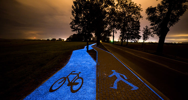 Nawierzchnia świecącej ścieżki rowerowej zawiera tzw. luminofory. To specjalne substancje syntetyczne, które „ładują” się za pomocą światła dziennego, a następnie nocą emitują nagromadzoną energię. Taka ścieżka nie potrzebuje dodatkowego zasilania – jest samowystarczalna i ekologiczna. Poprawia także bezpieczeństwo jazdy rowerzystów i ruchu pieszych po zmroku.