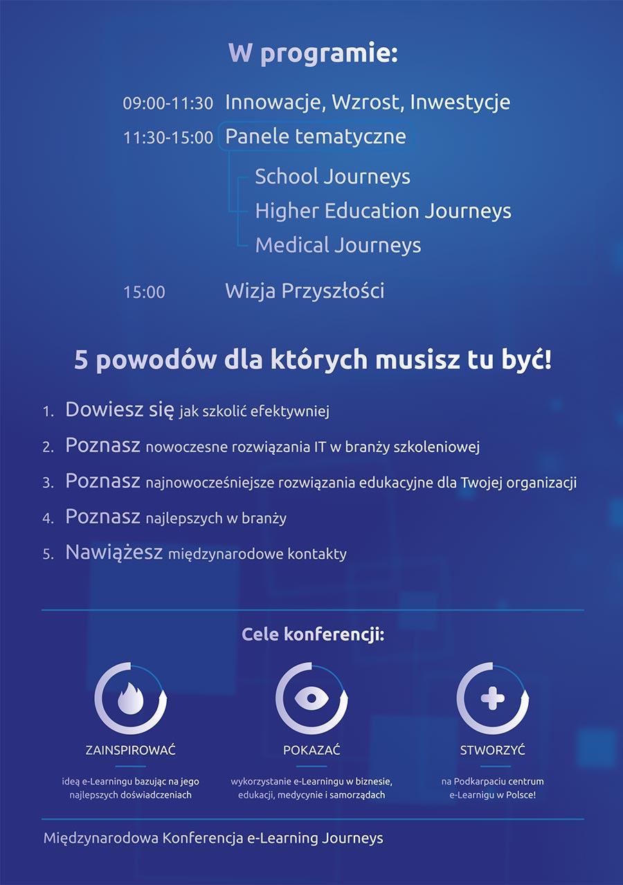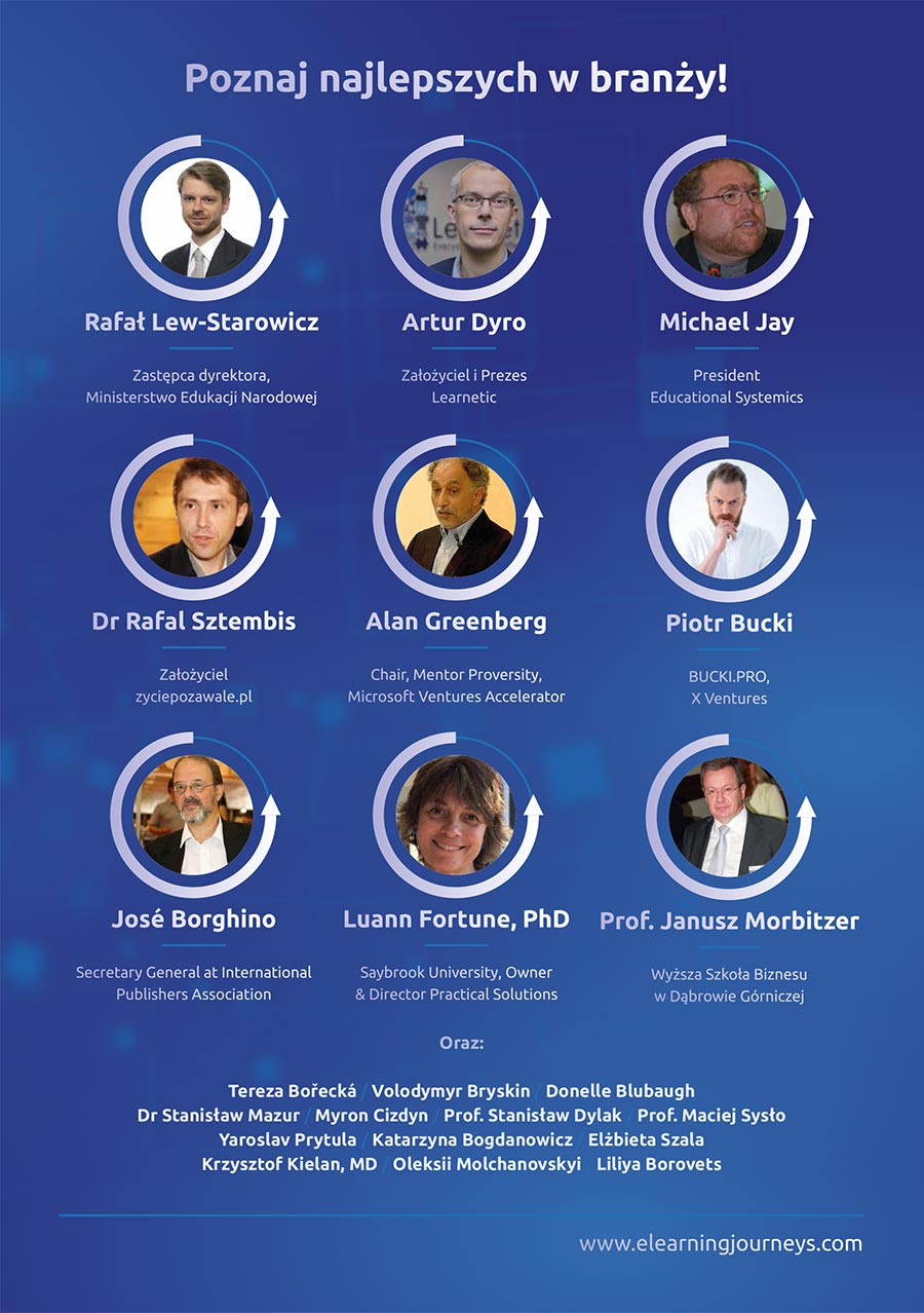 Prelegentami konferencji eLearning Journeys będą naukowcy i praktycy, pionierzy unikalnych metod edukacyjnych z całego świata. Swoje prelekcje wygłoszą m.in. Artur Dyro, współzałożyciel Learnetic S.A., jednej z wiodących firm na świecie zajmujących się rozwojem i wdrażaniem technologii wspierających edukację w obszarze technologii mobilnych oraz pomysłodawca i współzałożyciel Young Digital Planet S.A., platformy, która od 25 lat łączy nowe technologię i edukację, działając na ponad 45 rynkach świata, Dr Rafał Sztembis, założyciel edukacyjnego portalu internetowego www.zyciepozawale.pl czy Alan Greenberg, mentor w Microsoft Ventures Accelerator oraz były dyrektor Apple Education w Europie i Azji.