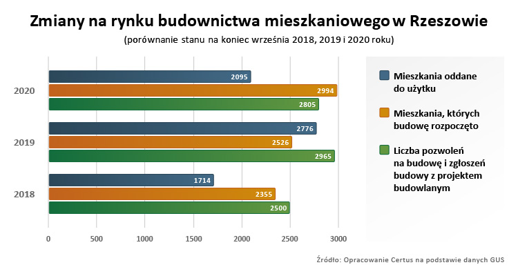 Rok 2019 był najlepszym rokiem, jeśli chodzi o budownictwo w Rzeszowie. Do użytkowania oddano niemal 3,3 tys. mieszkań, licząc zarówno te w budownictwie jedno-, jak i wielorodzinnym. Wcześniej ta liczba nie przekraczała trzech tysięcy, chociaż wyraźny wzrost zaczął się w 2015 roku, kiedy to w Rzeszowie przybywało średnio 2,5 tys. mieszkań rocznie.