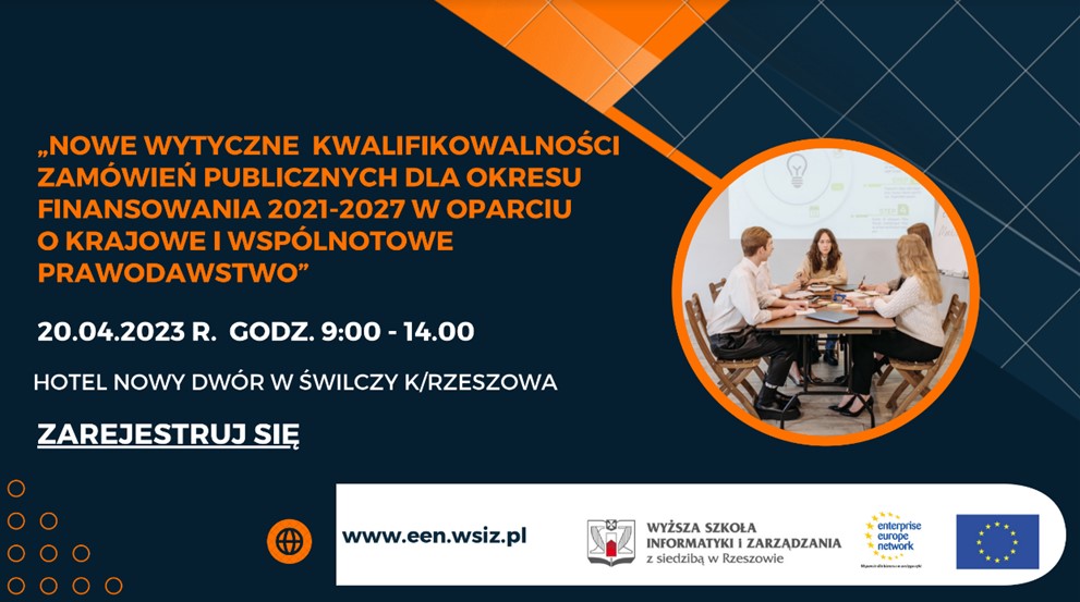 Ośrodek Enterprise Europe Network działający przy Wyższej Szkole Informatyki i Zarządzania z siedzibą w Rzeszowie, zaprasza przedsiębiorców z obszaru MŚP do udziału w bezpłatnym szkoleniu w formie stacjonarnej: „NOWE WYTYCZNE KWALIFIKOWALNOŚCI ZAMÓWIEŃ PUBLICZNYCH DLA OKRESU FINANSOWANIA 2021-2027 W OPARCIU O KRAJOWE I WSPÓLNOTOWE PRAWODAWSTWO”