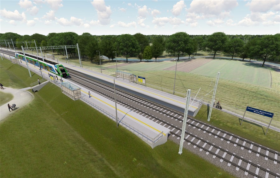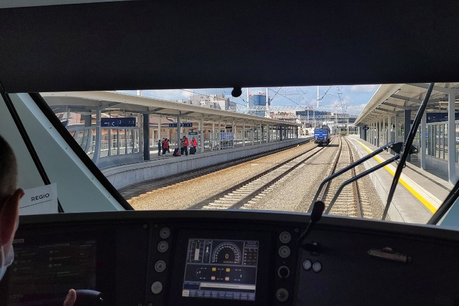 Widok z kabiny maszynisty na tory perony i pociąg na stacji Rzeszów Główny. Fot. Mirosław Siemieniec