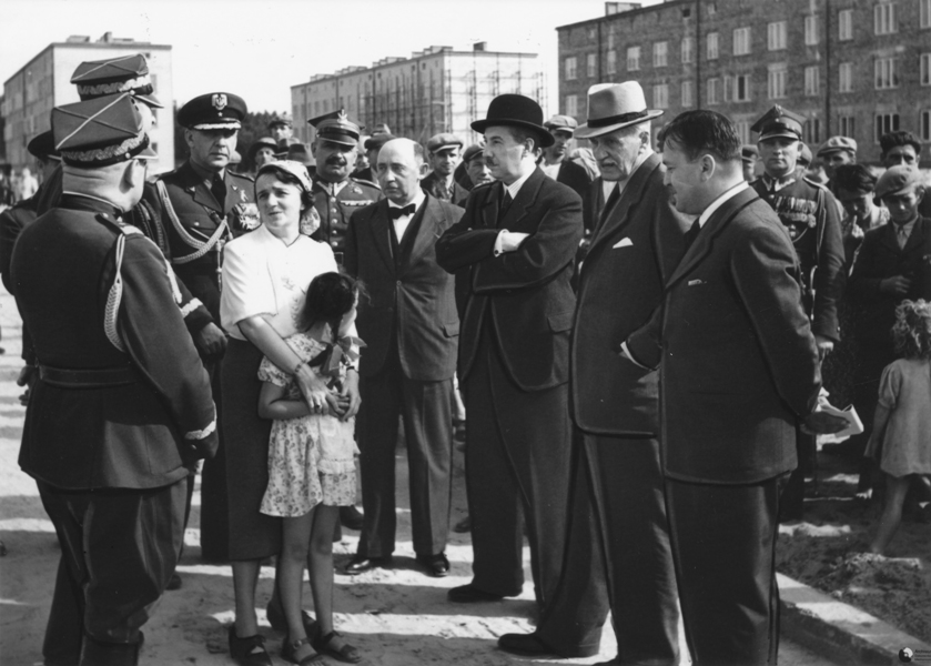 Wicepremier i minister skarbu inż. Eugeniusz Kwiatkowski (w czarnym kapeluszu), obok prezydenta Rzeczypospolitej Polskiej prof. Ignacego Mościckiego (w jasnym kapeluszu). Na pierwszym planie, także obok prezydenta RP, inż. Stanisław Krzyczkowski - pierwszy dyrektor naczelny zakładów lotniczych w Mielcu w latach 1937-1939. Naprzeciwko generalicja - lekko odwrócony, wiceminister spraw wojskowych, szef administracji armii gen. bryg. inż. Aleksander Litwinowicz, na wprost - tuż za prezydentową Marią Mościcką z młodziutką mielczanką - gen. bryg. pil. Władysław Kalkus, pełniący obowiązki dowódcy lotnictwa w Ministerstwie Spraw Wojskowych. Źródło: Urząd Miejski w Mielcu