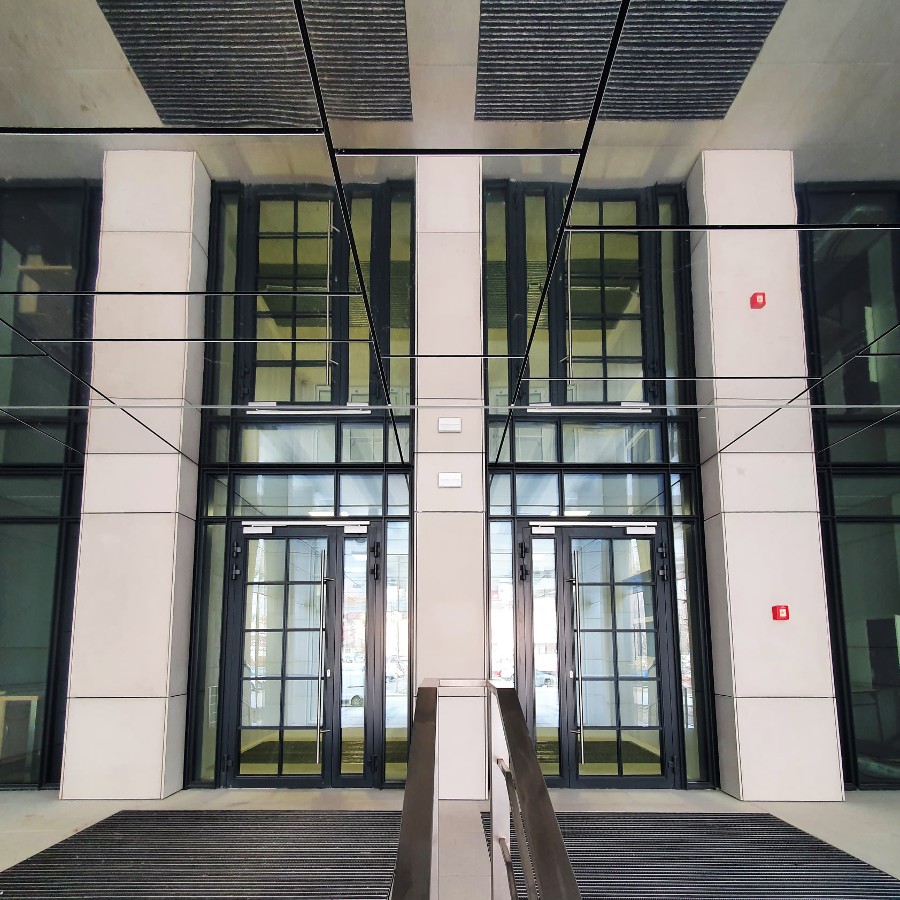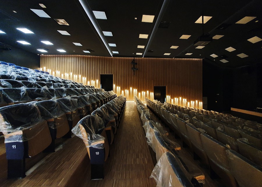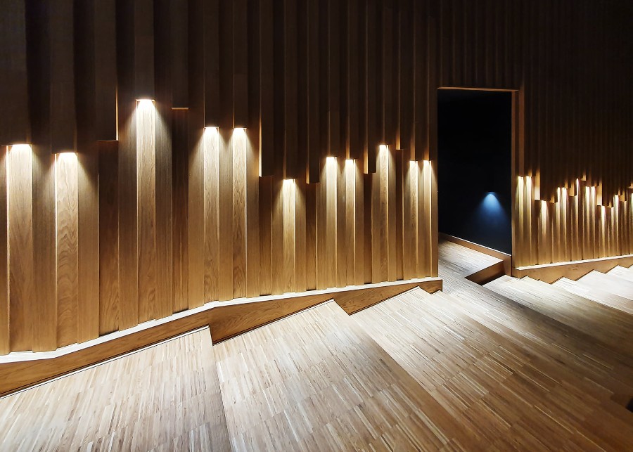 Powiększono również drugą, małą salę audytoryjną. Drewniane wykończenia podłóg i drzwi ociepliły korytarze części administracyjnej, w której mieści się sala senatu - usytuowana nad strefą wyjściową i wsparta filarami.
