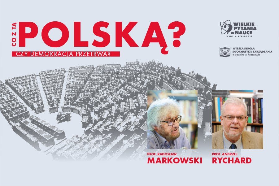 Już za tydzień, w środę, 11 maja o godz. 17 w Filharmonii Podkarpackiej wykład „Co z tą Polską? Czy demokracja przetrwa?” organizowany przez Wyższą Szkołę Informatyki i Zarządzania w Rzeszowie w ramach cyklu „Wielkie Pytania w Nauce”. Gośćmi spotkania będą: prof. Andrzej Rychard oraz prof. Radosław Markowski. Wstęp na wydarzenie jest bezpłatny, ale wcześniej trzeba pobrać bilet ze strony - https://wielkiepytania.wsiz.pl/wpwn/wydarzenia/co-z-ta-polska/rejestracja. Są jeszcze wolne miejsca!