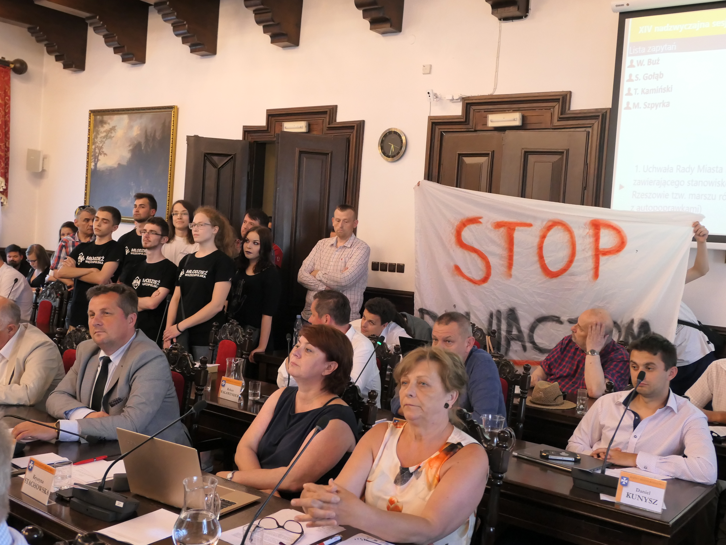 To była gorąca środa w Ratuszu - zwołana w trybie nadzwyczajnym sesja Rady Miasta, podczas której dyskutowano nad uchwałą zaproponowaną przez radnych PiS, sprzeciwiającą się promocji ideologii LGBT w przestrzeni publicznej, zakończyła się odrzuceniem projektu. Przeciw było 9 radnych z Komitetu Rozwoju Rzeszowa i Platformy Obywatelskiej, 7 osób z klubu PiS głosowało za, a 4 z Komitetu Rozwoju Rzeszowa wstrzymało się od głosu.