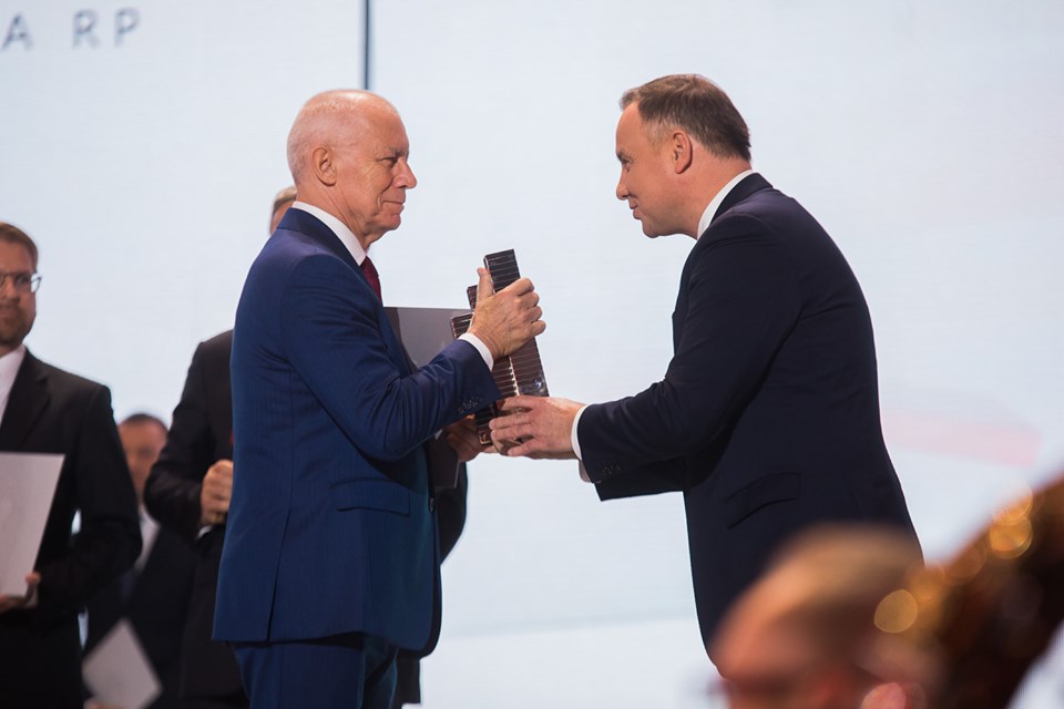 Stanisław Jedliński, prezes Olimp Labs odbiera nagrodę z rak prezydenta Andrzeja Dudy. Fot. Podkarpackie.pl