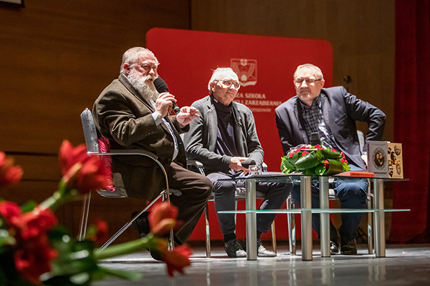 - Kiedy wiemy, że mamy rozmawiać i jeszcze mam dbać o to, żeby dobrze rozmawiać, to ta rozmowa traci to, co jest dla niej bardzo ważne - naturalność, spontaniczność. Przeżywamy pewien stres. Trzeba od czegoś zacząć, a rozmowa ma być swobodna. Ten chaos rozmowy dobrze oddał Adam Mickiewicz opisując spotkanie Wojskiego z Tadeuszem: „Zaczęła się ta prędka, zmieszana rozmowa,/ W której lat kilku dzieje chciano zamknąć w słowa/ Krótkie i poplątane, w ciąg powieści, pytań,/ Wykrzykników i westchnień, i nowych powitań.” Taka właśnie rozmowa powinna być - spontaniczna, sprawiająca radość. To w końcu nasze najbardziej naturalne bycie z ludźmi, a bycie z ludźmi jest naszym naturalnym byciem w ogóle - zwrócił uwagę publiczności już na wstępie spotkania prof. Jerzy Bralczyk. Słynny językoznawca sypał cytatami klasycznych dzieł, skrzył dowcipem i sypał anegdotami, dając doskonały przykład zgrabnego mówienia i budząc nieśmiałość umiejętnością słownej szermierki. Rozmówców miał jednak godnych - red. Michała Ogórka, dziennikarza i satyryka, z którym już niejedną wspólną książkę „popełnił” (np. „Kiełbasa i sznurek”, „Na drugie Stanisław. Nowa księga imion”), oraz prowadzącego spotkanie Wojciecha Bonowicza, dziennikarza i poetę, finalistę Nagrody Literackiej Nike 2018.