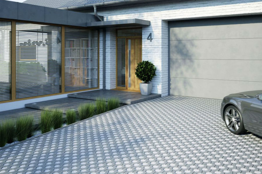Oryginalnym pomysłem na zachowanie zielonej przestrzeni na podjeździe jest wykonanie z płyt ażurowych, pasów odwzorowujących rozstaw kół samochodu i obsianie trawą przestrzeni pomiędzy nimi i po ich obydwu stronach. W realizacji takiego zamysłu może pomóc jeszcze jedno interesujące rozwiązanie, które nie posiada tak dużych otworów jak Greengo czy Meba, ale stanowi ciekawą alternatywę. Jest nim Polbruk Ekol – kostka betonowa z charakterystycznymi wypustkami na bokach, które gwarantują odpowiednie usytuowanie elementów w rzędzie. Najczęściej szczeliny pomiędzy ułożonymi elementami są wypełniane ziemią lub grysem, co pozwala na wsiąkanie wody w grunt. Tym samym powstaje mini przestrzeń bioaktywna. Ekol jest bardzo oszczędny w formie, ascetyczny i świetnie pasuje do nowoczesnej architektury, gdyż posiada kształt kwadratu o boku 20 cm, gładką fakturę, a także występuje w dwóch odcieniach szarości (kolor szary i grafitowy). Ułożony na większej powierzchni podjazdu lub na szerokość rozstawu kół, przywodzi na myśl nieco industrialne klimaty spotykane w fabrykach z przełomu XIX i XX wieku. W niektórych z nich ciągi komunikacyjne wykładano żeliwnymi płytami o deseniu przypominającym kartkę w kratkę.