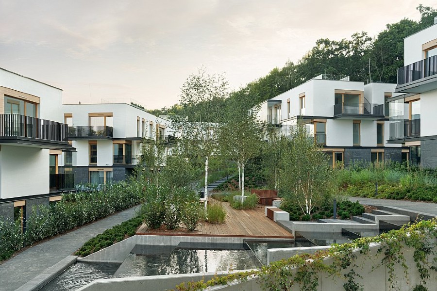 Dlatego nie tylko zadbano o maksymalne zachowanie istniejącego drzewostanu, lecz także zaplanowano nowe nasadzenia, osiągając w ten sposób efekt lasu „wlewającego się” pomiędzy budynki. Pomyślano również o niskiej zieleni, jak trawy czy byliny. Natura gości także we wnętrzach takich jak sauna, strefa fitness czy sala klubowa –dominuje w nich kamień, szlachetne drewno, roślinność oraz designerskie meble i detale.
