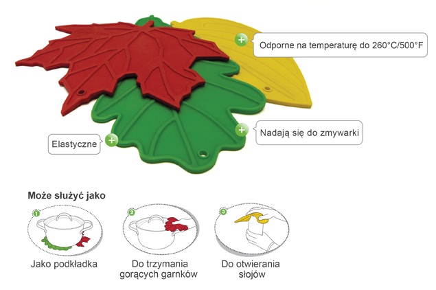 Na liście rzeczy w kuchni niezbędnych są podkładki. W czasie gotowania często trzeba zestawić gorący garnek lub patelnię z ognia. Można odstawić je na blat, oczywiście jeśli jest z naturalnego kamienia, odpornego na wysokie temperatury. Ale nawet w takiej sytuacji warto zaopatrzyć się w specjalne podkładki. Mogą być drewniane, korkowe lub z tworzywa sztucznego odpornego na bardzo wysokie temperatury. Świetną propozycją są też silikonowe. Ich zaletą jest nie tylko odporność na temperatury, bo nic się im nie stanie nawet w 260 stopniach C. Nadają się do zmywarki, są też bardzo elastyczne, więc mogą zastępować ścierkę przy trzymaniu garnków lub otwieraniu słoików. A do tego mają przeróżne kształty i kolory, a taki barwny dodatek może być wspaniałą ozdobą kuchni.