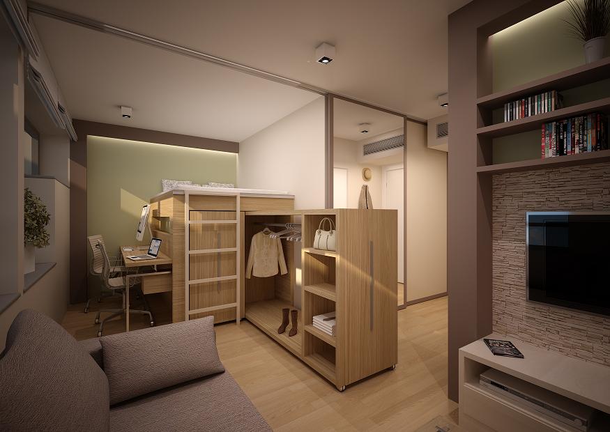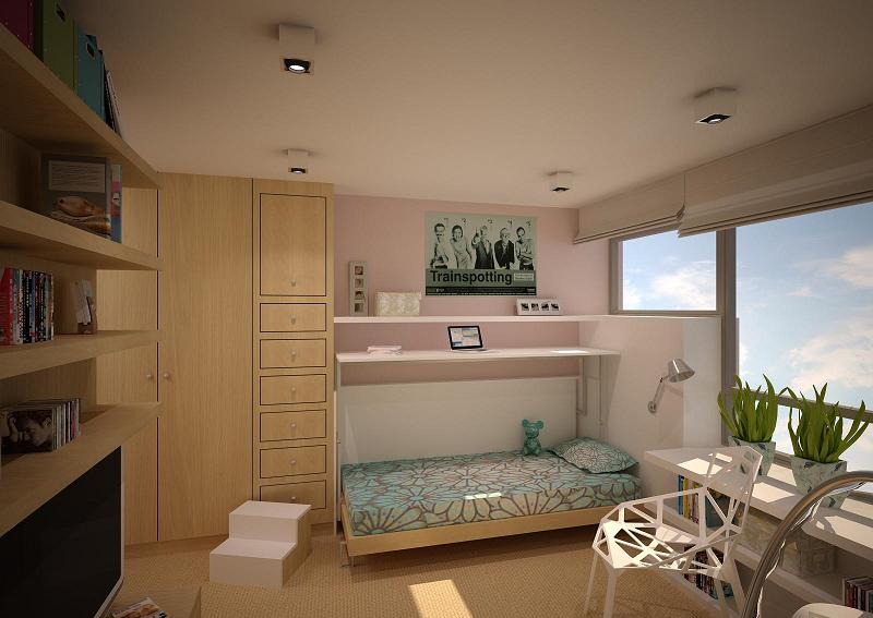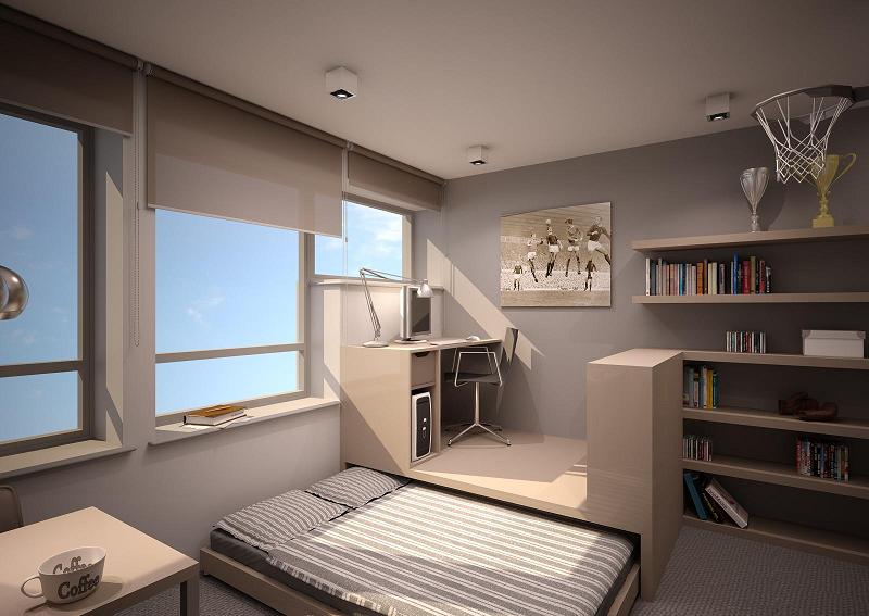 Proszę bardzo. Łóżko na podwyższeniu, pod którym znajduje się szafa ubraniowa lub podest z miejscem do pracy, spod którego można łóżko wysunąć. Sprawdzają się także meble, który w zależności od potrzeb staje się biurkiem albo łóżkiem.