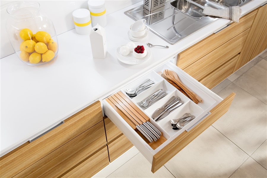 Minimalizm stawia na duże połacie gładkich frontów kuchennych, za którymi można schować nie tylko garnki, talerze, roboty i mieszadła, ale także piekarnik i lodówkę. Warto zaznaczyć, że styl, ukrywając sprzęt i dodatki, nie zabiera niczego z funkcjonalności. – Szuflada Matrix P w wersji push-to-open i cichym zamykaniem z nowym mechanizmem pozwala na minimalistyczne aranżacje – wskazuje Michał Kichler z Häfele. – Dzięki najnowszym rozwiązaniom fronty bezuchwytowe zamykają się bardzo cicho. Szuflada wyróżnia się dużą pojemnością i udźwigiem. Bez problemu zmieszczą się w niej akcesoria i cięższy sprzęt kuchenny codziennego użytku – podkreśla.