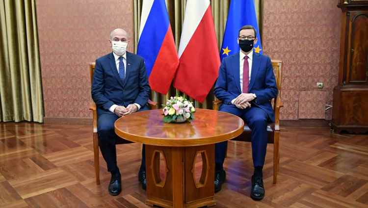 Premier RP Mateusz Morawiecki oraz premier Słowenii Janez Jansa podczas spotkania w siedzibie KPRM w Warszawie. Fot. Marcin Obara/PAP