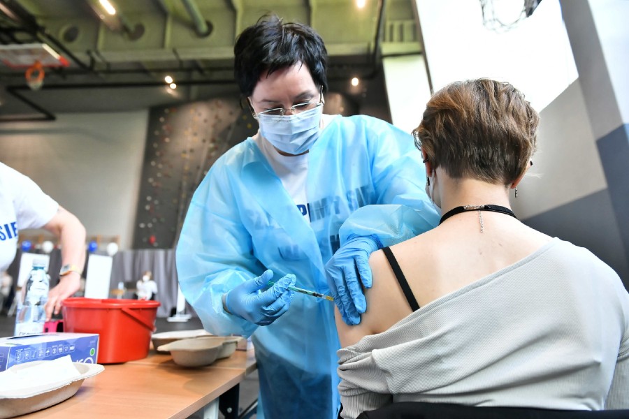 Punkt szczepień przeciw COVID-19 dla wrocławskich uczniów w V LO we Wrocławiu, 1 bm. Fot. Maciej Kulczyński/PAP