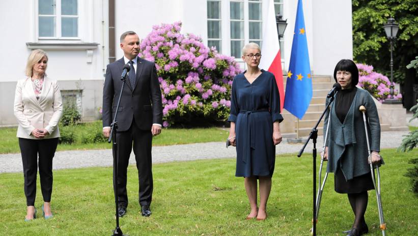 Andrzej Duda spotkał się w piątek w Warszawie z liderami białoruskiej opozycji Swiatłaną Cichanouską i Pawłem Łatuszką. Rozmawiał także z przedstawicielkami polskiej mniejszości narodowej na Białorusi: Ireną Biernacką, Anną Paniszewą i Marią Tiszkowską, które - jak zaznaczył - po zabiegach polskiej dyplomacji opuściły białoruskie więzienie i od 25 maja przebywają w Polsce.